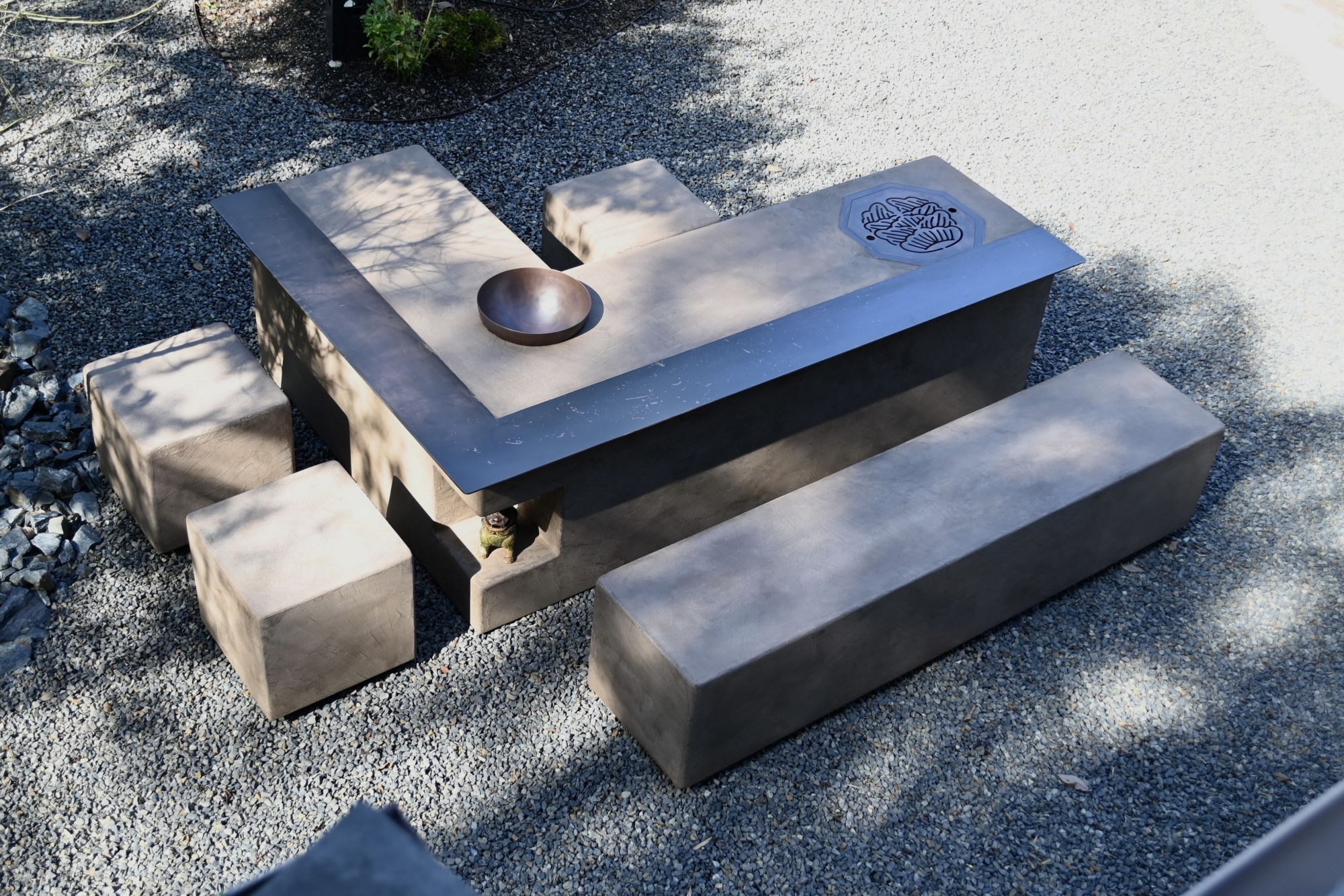 立礼卓は、木下地でモールテックにて仕上げました。窓に合わせて8角形に炉を切り、炉蓋にはお寺の家紋を入れさせていただきました。