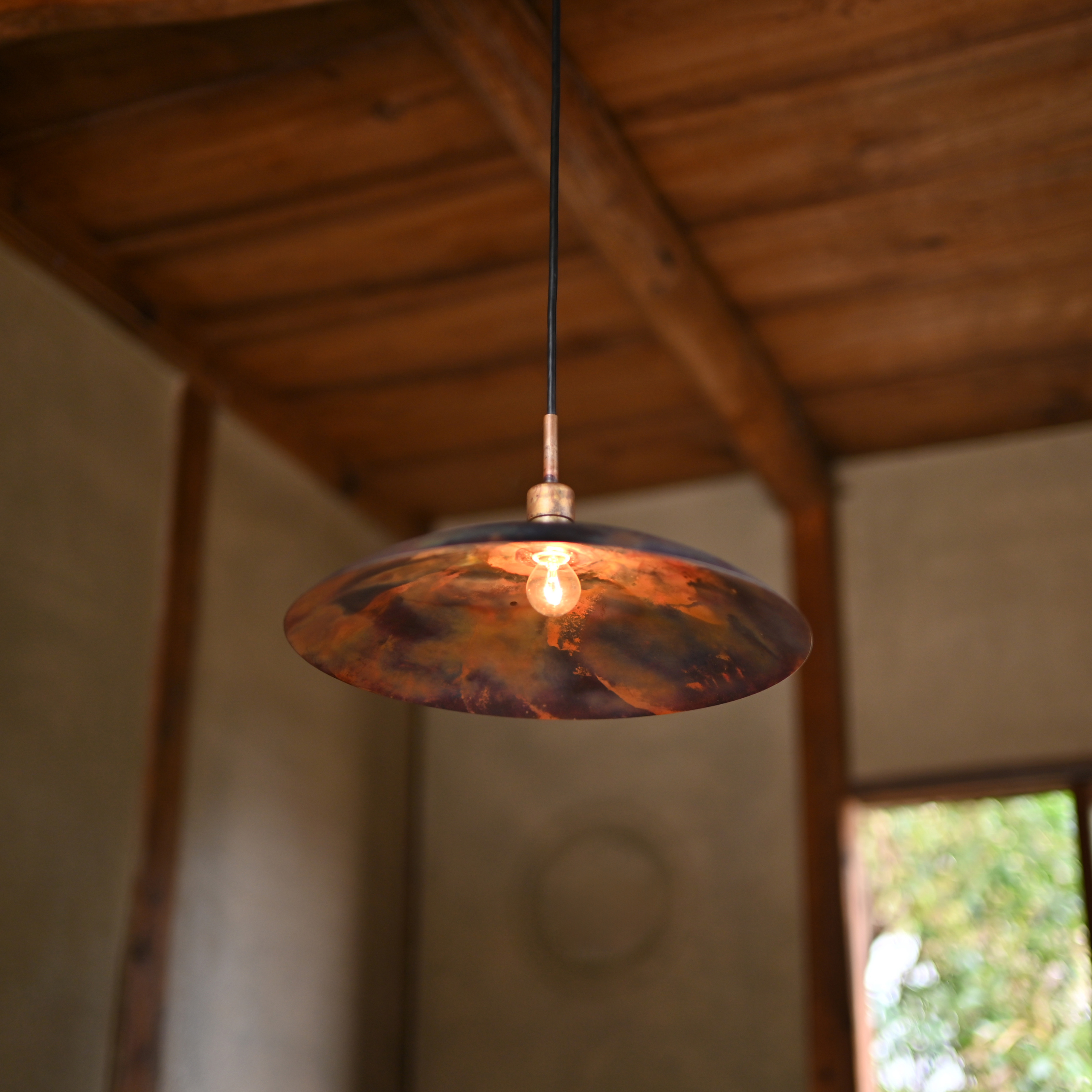 この吊下げ照明は、加工の工程そのものを意匠とした一作です。“焼き鈍し、叩き出す” を繰り返し、成形しています。加工跡の風合いを前面に生かし、日常の灯りとしても、空間を彩るアートピースとしてもお楽しみいただけます。