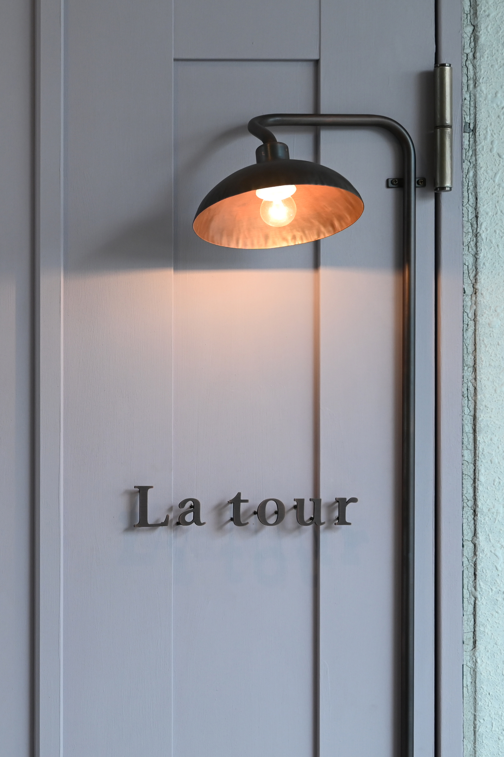 電線を通す配管をパイプでデザインした特注照明。コンセントからの電源配線をデザインとして考え、機能美をカタチにしました。アトリキーメンではパイピング照明と呼んでいます。この照明は電気工事士でなくても取付可能です。近くにコンセントがある壁でしたら、屋内外問わず設置でき、屋内仕様のみボールチェーンのプルスイッチ式のスイッチとなります。