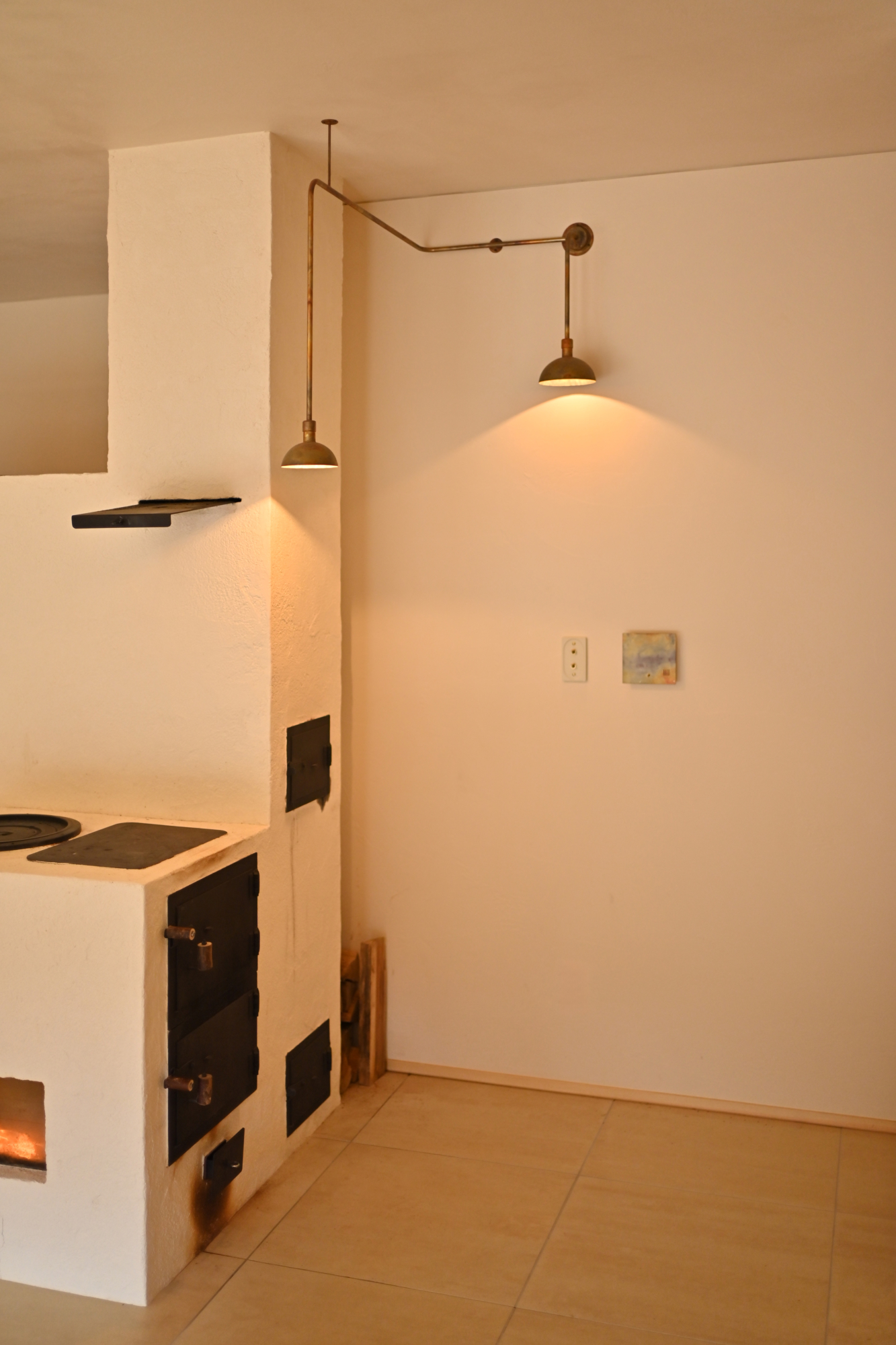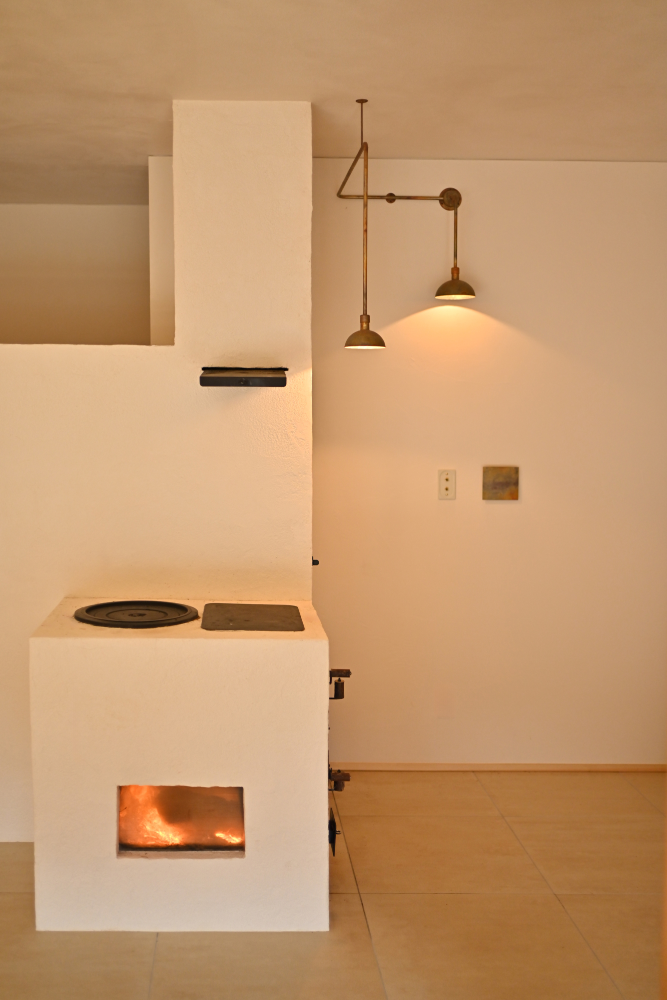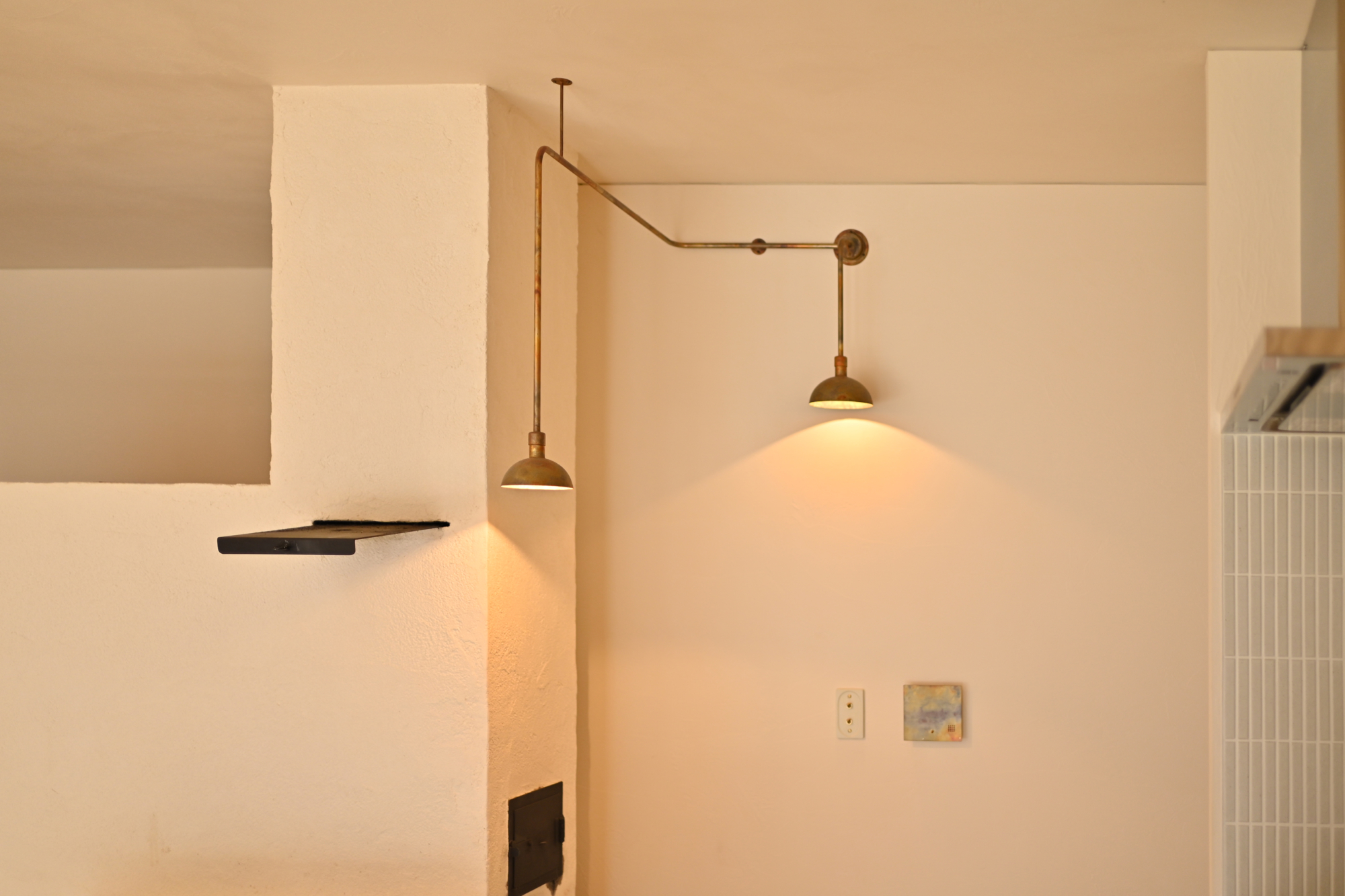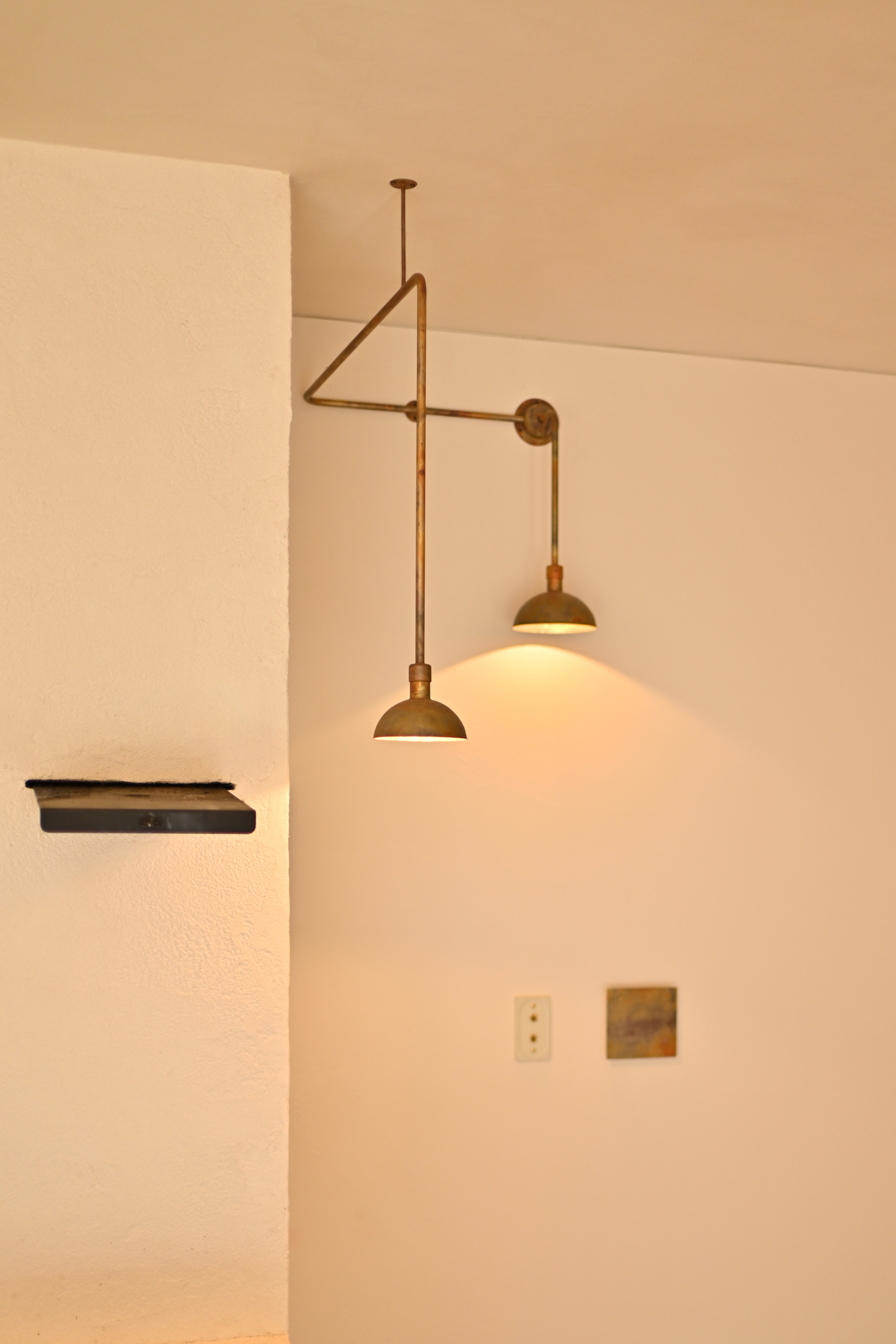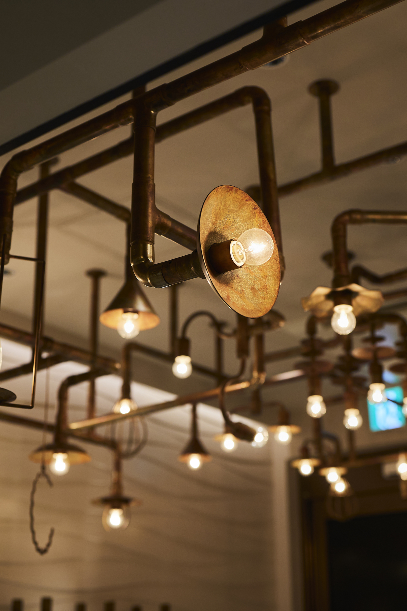 電線を通す配管をパイプでデザインした特注照明。壁や天井からの電源配線をデザインとして考え、機能美をカタチにしました。アトリキーメンではパイピング照明と呼んでいます。明かりが欲しい場所に電源がない際に有効です。